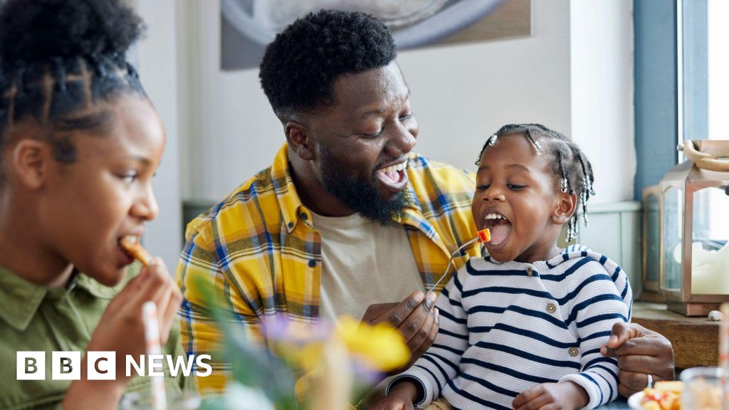 Getty Images A father feeds a piece of fruit on a fork to his young daughter, who is sitting on his lap. Her older sibling is also sitting at the tableGetty Images