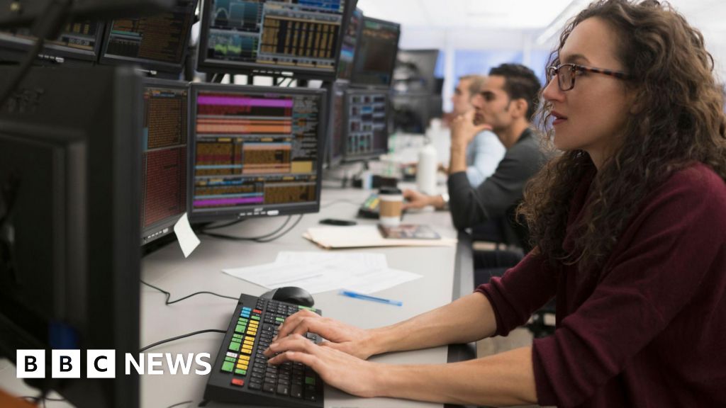 Getty Images Female trader with long hair and glasses sits at keyboard in front of screensGetty Images