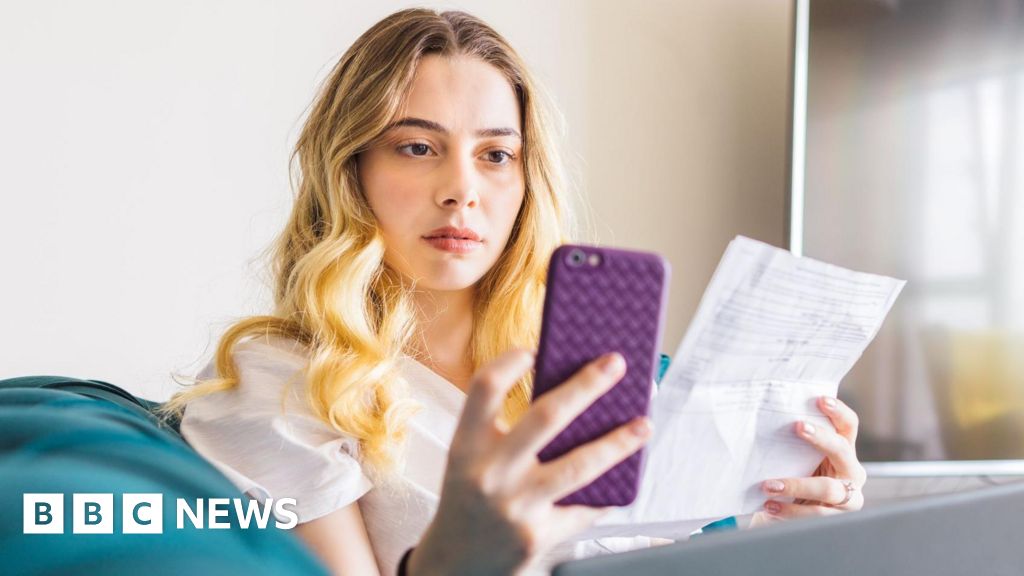 Getty Images A young blonde woman with a look of concentration stares at her smartphone while holding a bill in her other handGetty Images