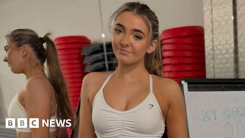 BBC A young women with blonde hair in a ponytail and wearing a white sports bra top looks at the camera. A mirror in the background shows her reflectionBBC
